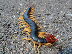 The centipedes don’t sting with their tail. It looks like a stinger, but it might just be for show — to distract potential predators from the actual dangerous end. The first set of legs behind the head is actually the poison source.