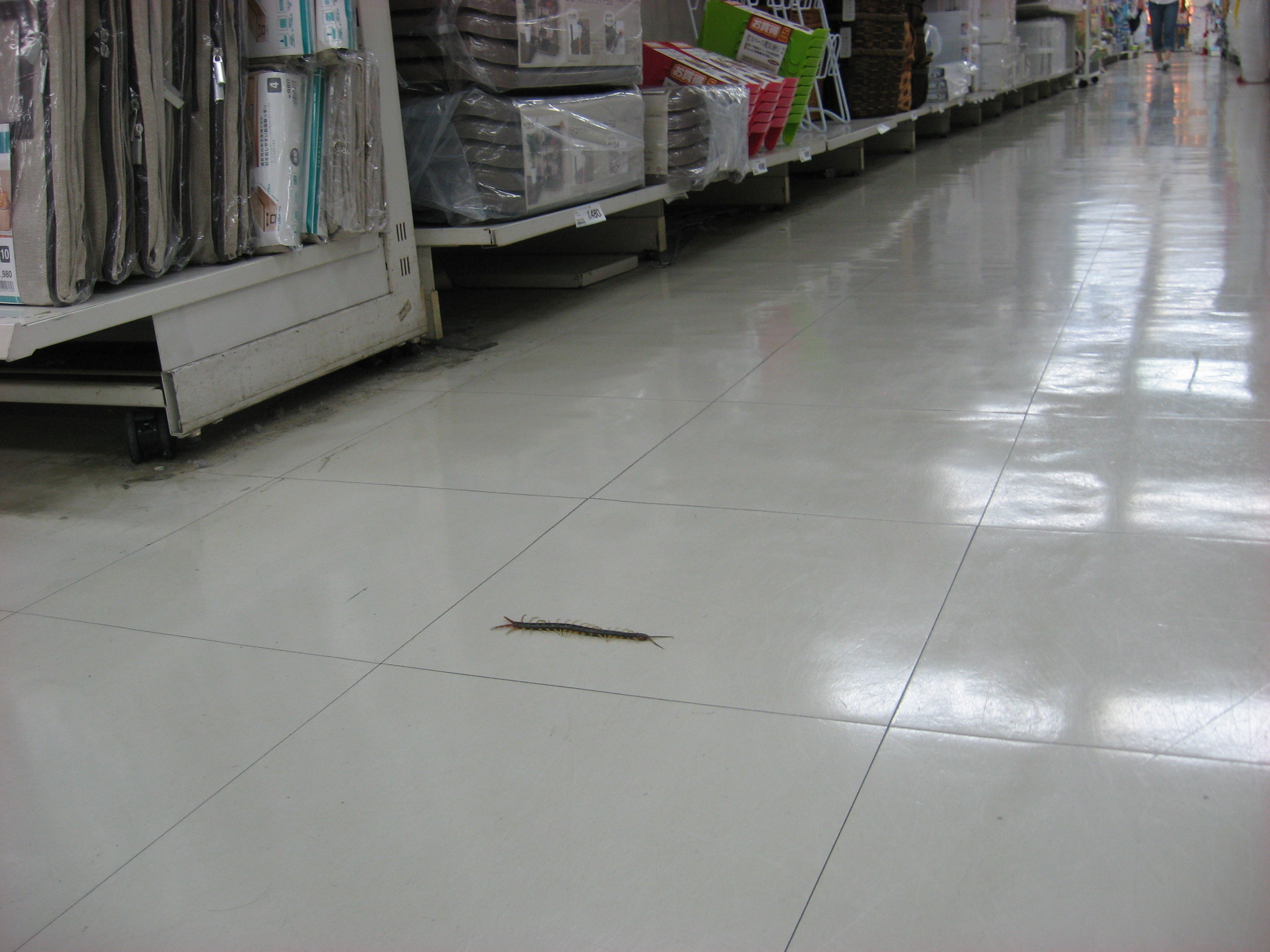 I crie out a warning. Instantly everyone in the vicinity is alarmed. Japanese women shriek in anxiety. Store personnel flocks to the crime scene. Calls to store department managers are being made. Meanwhile I’m trying to get a good picture of the mukade but it spots me and starts running in my direction (they are very fast!). I am forced to retreat. One dutiful employee tries to catch the mukade with a broom and a dustbin. But it outruns us all and hides beneath some shelves.