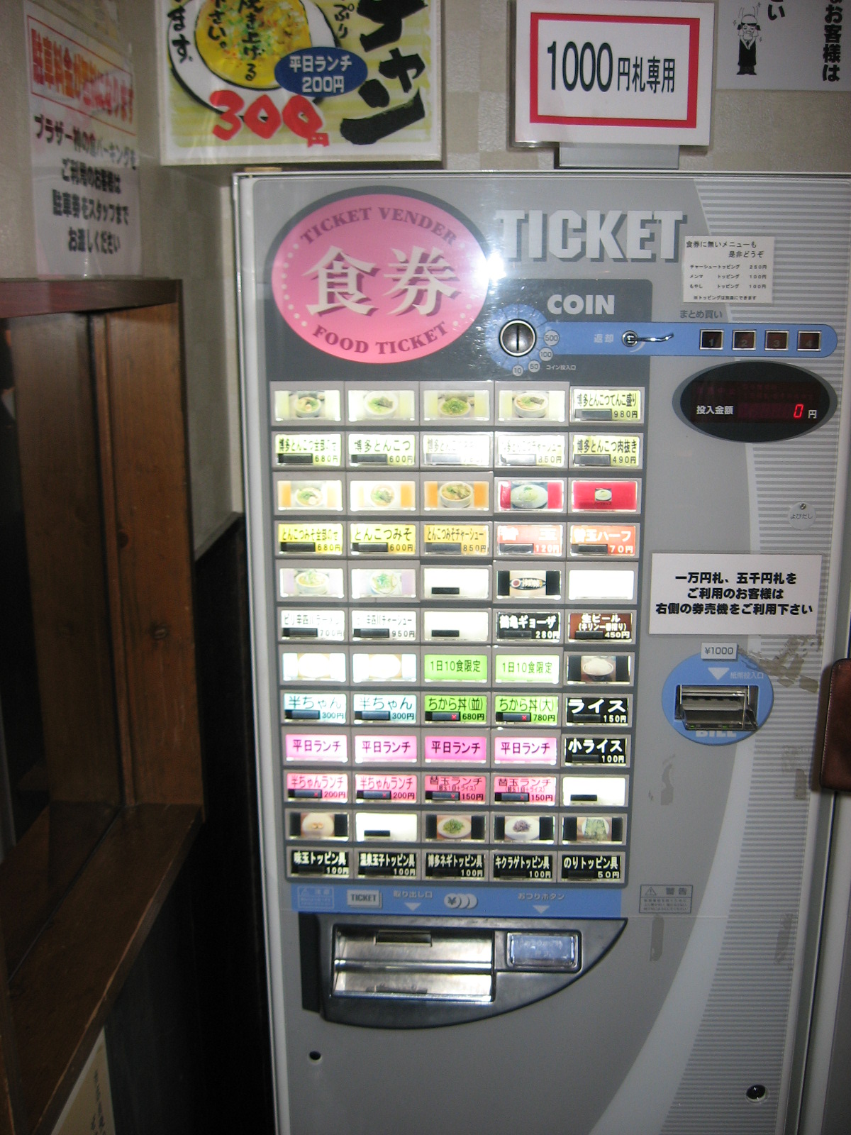 Interesting detail: you pay your dinner before entering the restaurant, by inserting money in a machine and indicating the desired dish. The machine then spits out a ticket, which you take inside and give to the waiter.