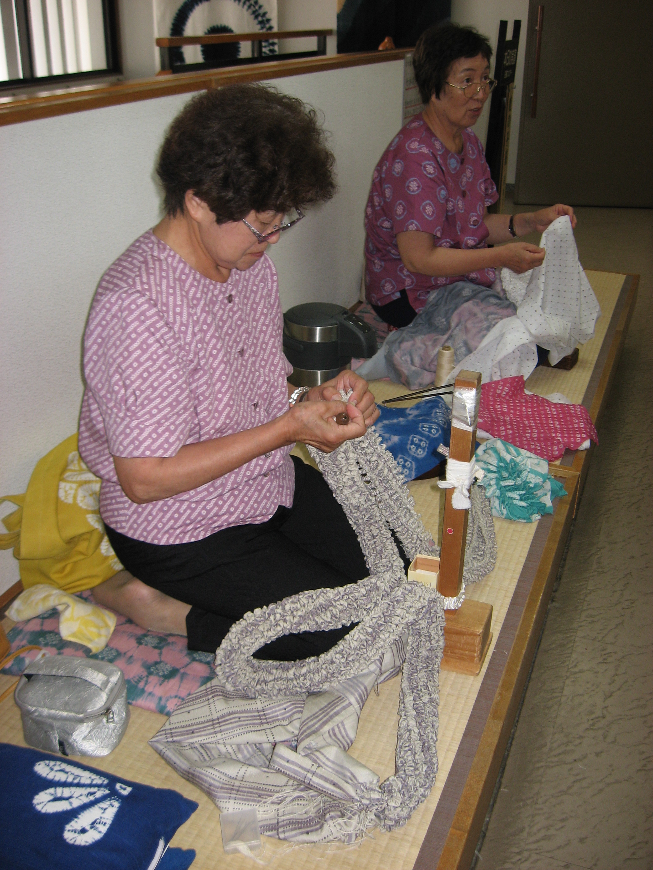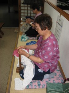 It turns out we could have a go at shibori ourselves. Our friends had arranged for a workshop in the local museum. Upon arrival, we were immediately given a piece of cloth and a needle and were put to work. Two ladies of a respectable age with at least 50 years of shibori experience each, taught these clumsy gaijin how to make a simple shibori cloth. Unfortunately we could not see the dying process but they will send us the finished cloth once it has been dyed.