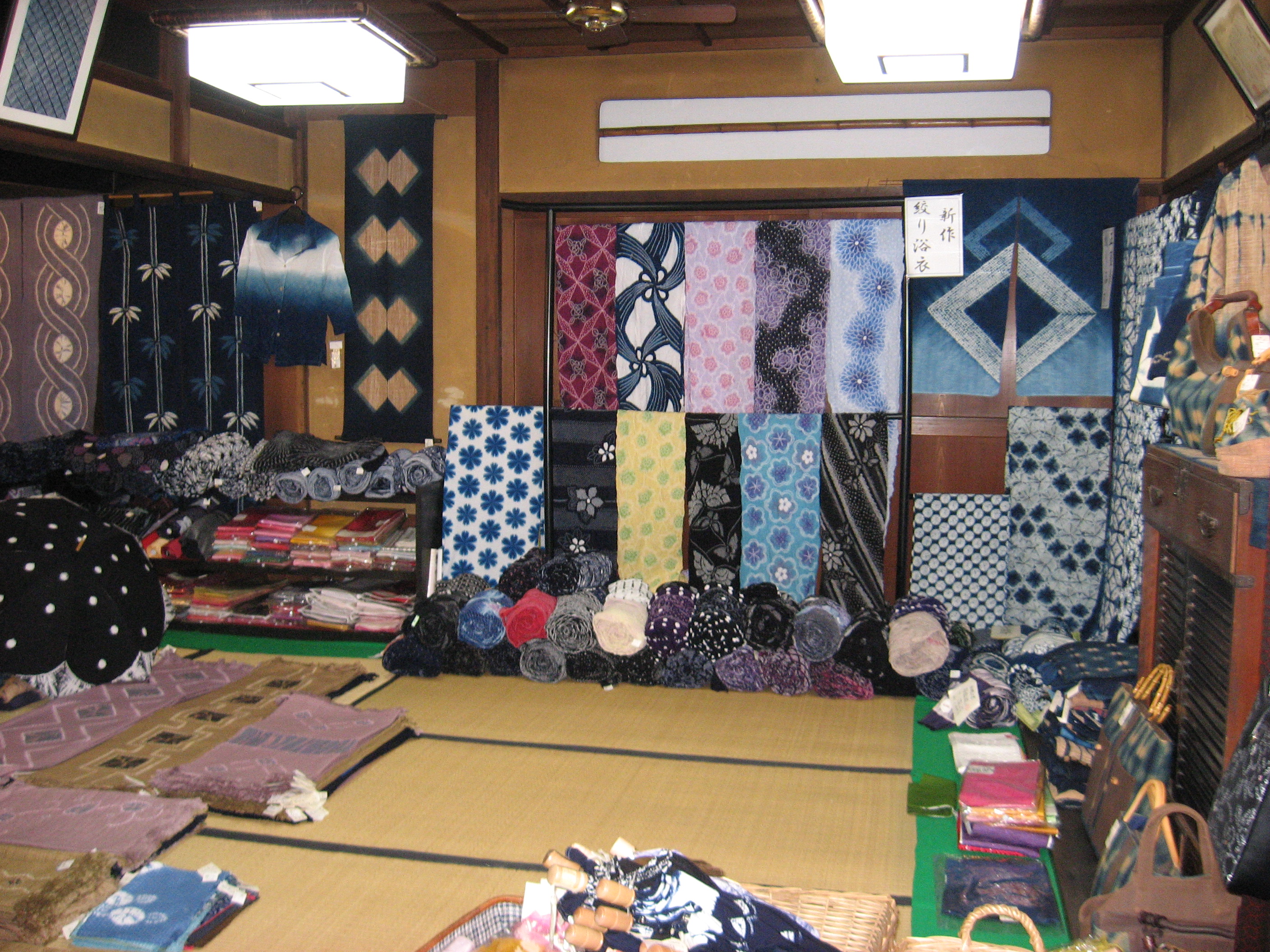 Located on the Tokaido (ancient road from Tokyo to Kyoto), Arimatsu is famous for ‘shibori’ or tie-dyed cloth. The cloth is tied up with rope before dying, thus preventing certain parts of the cloth from being dyed. It’s not just fuzzy circular patterns, it really leads to intricate patterns.