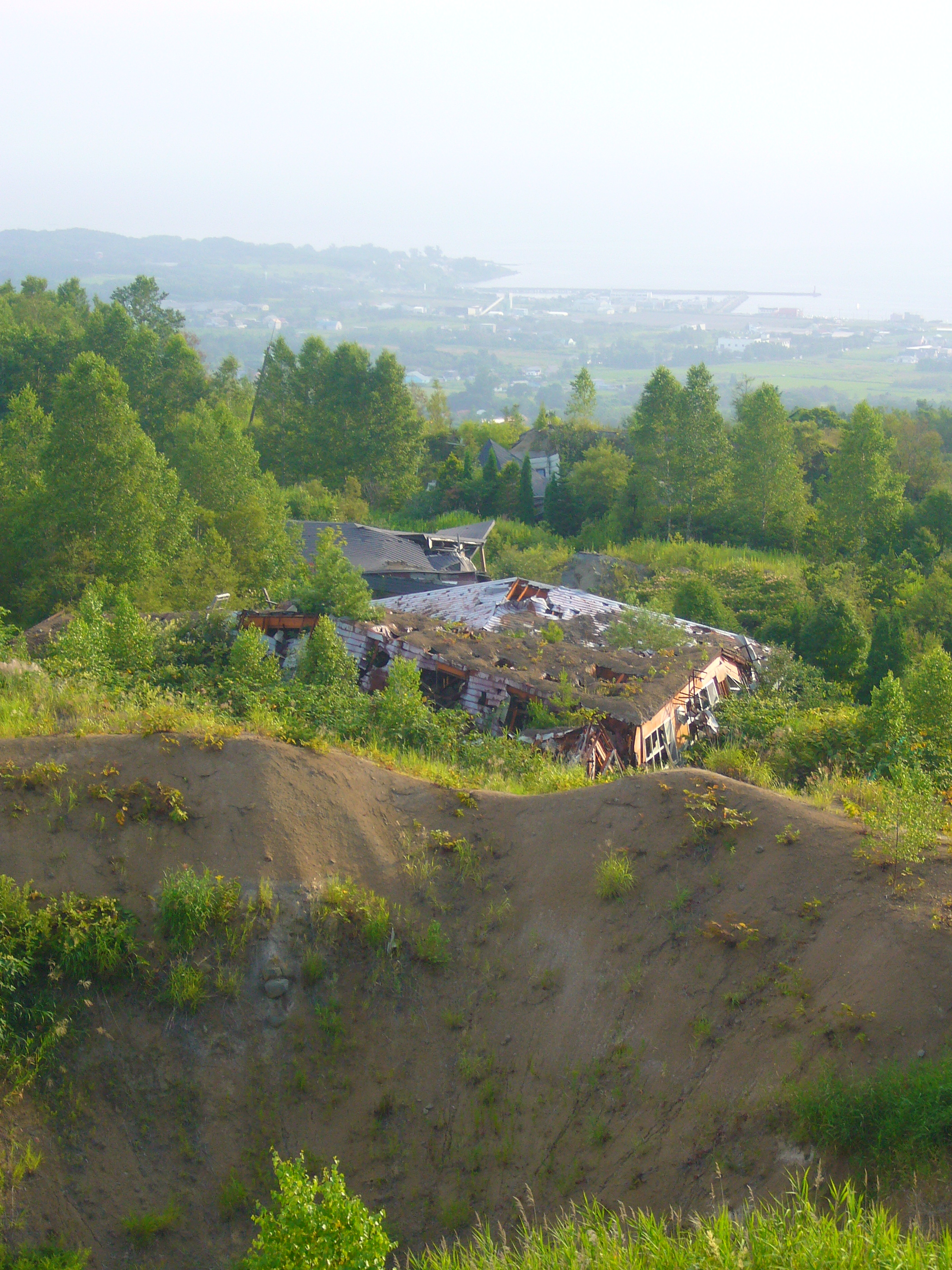 Ghost town. The orange building in the back used to be a cooky factory - image taken at the Nishiyama Crater Promenade