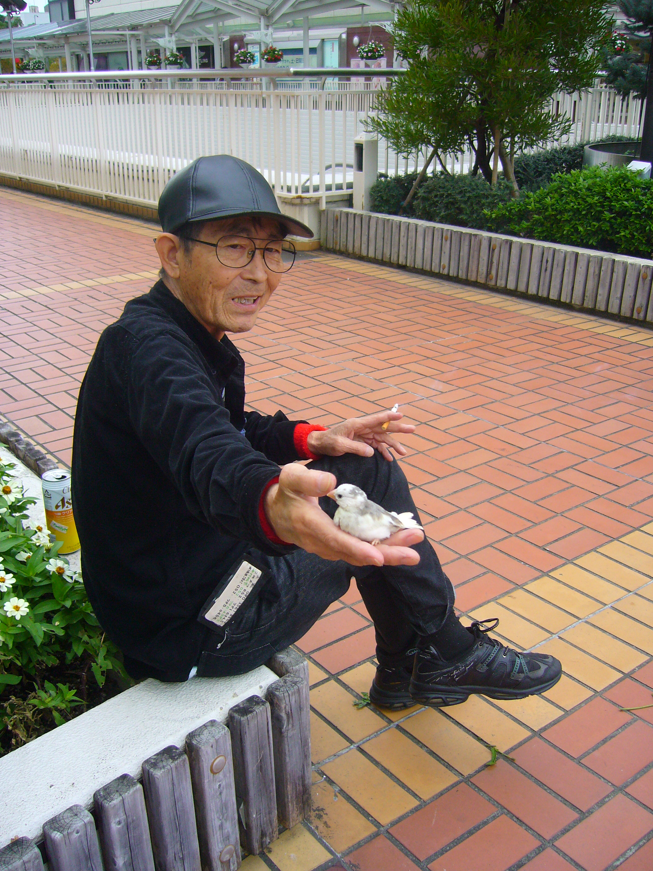 Bunnyman was obviously very pleased to have attracted my attention. As I was taking pictures of the bunnies, he produced a small bird from somewhere behind him and offered it to me. It was very tame, just like the bunnies. I held the bird for a moment, took a quick snapshot of Bunnyman and unfortunately had to rush off again.