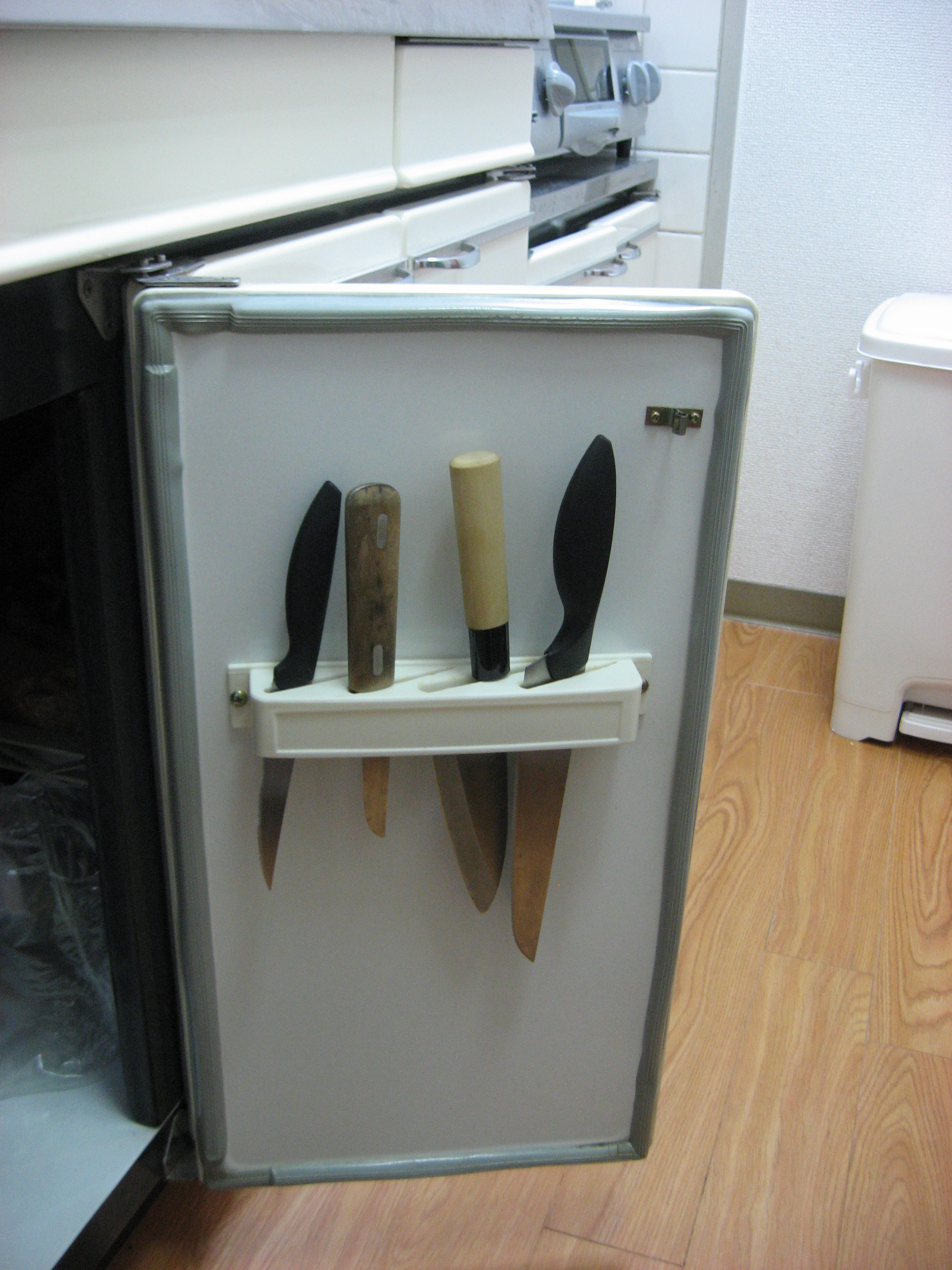 1. It wasn’t obvious to me at least. Maybe it’s best not to generalize based on my personal experience, in case other foreigners are quicker to grasp the meaning of this ‘contraption’ 🙂 In my experience knife holders were always big wooden blocks that are placed on the kitchen counter. But of course that’s not very convenient in small Japanese homes.
