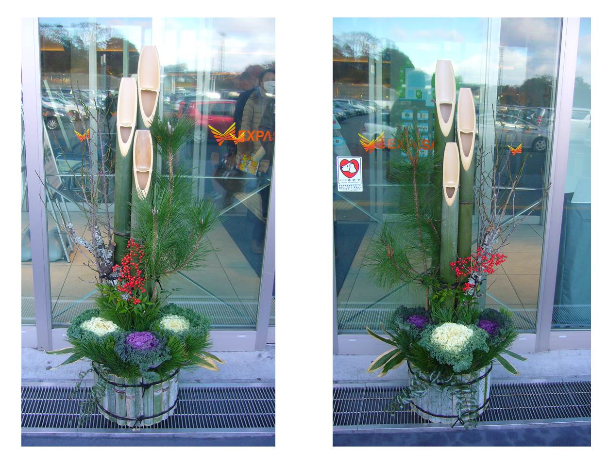 The two decorations on the ground are kadomatsu (門松, literally ‘pine gate’). Kadomatsu always come in pairs. Designs vary depending on region but they are typically made of bamboo and pine. Pine is considered lucky because it remains green in winter. Sometimes plum (ume) tree sprigs are also included, which represent longevity, prosperity and steadfastness.