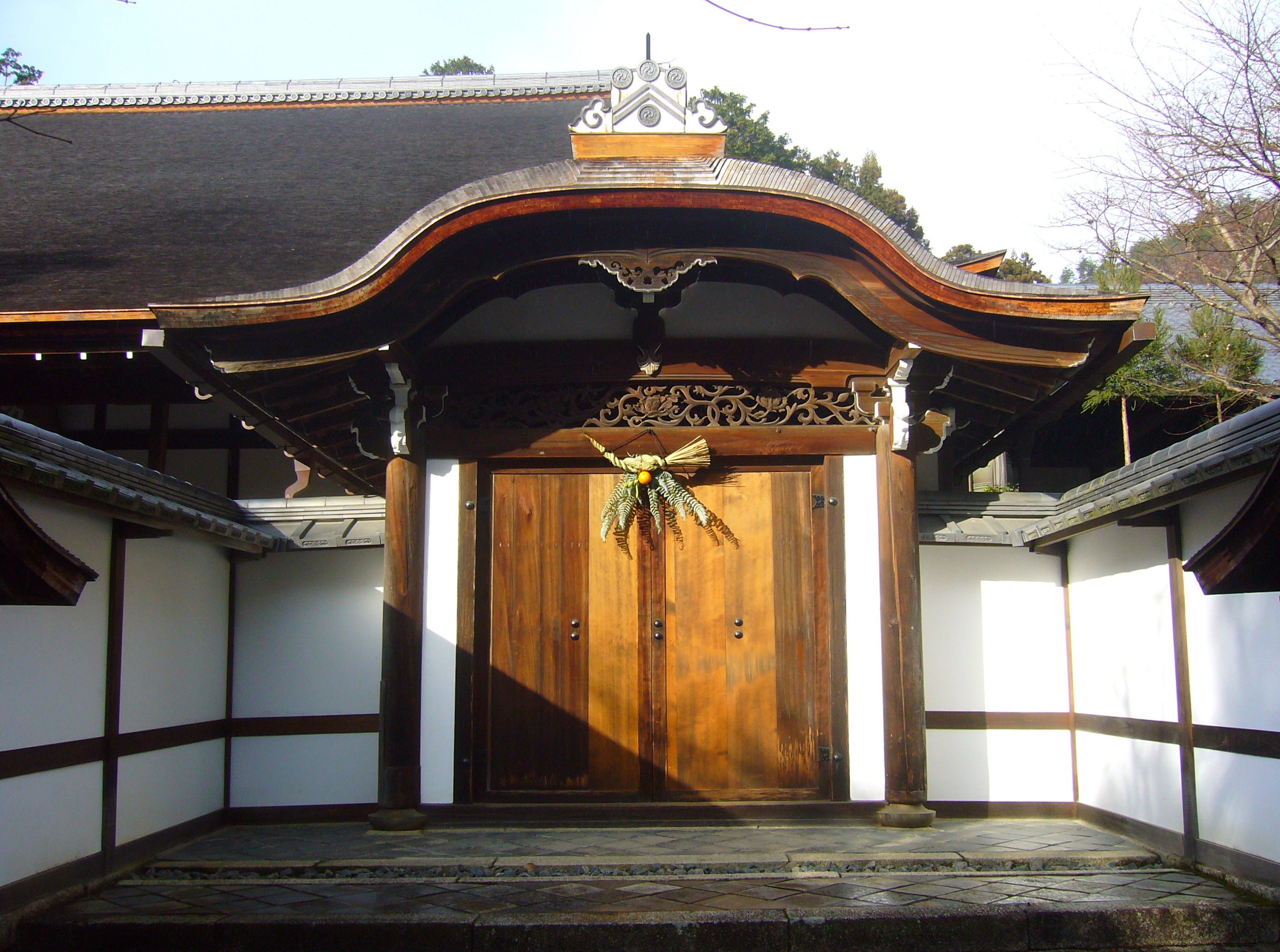If you look back at the first picture – the one of the restaurant – you will also see a decoration above the door. That is a shimekazari (しめ飾り). Again, there are many different designs for shimekazari but most of them include a sacred braided straw rope (shimenawa), fern leaves, white ritual paper strips (shide) and a bitter orange (daidai). Like the kadomatsu, the shimekazari invites the New Year’s God to visit the home. Additionally, it is also meant to keep out bad spirits and thus prevent bad luck.
