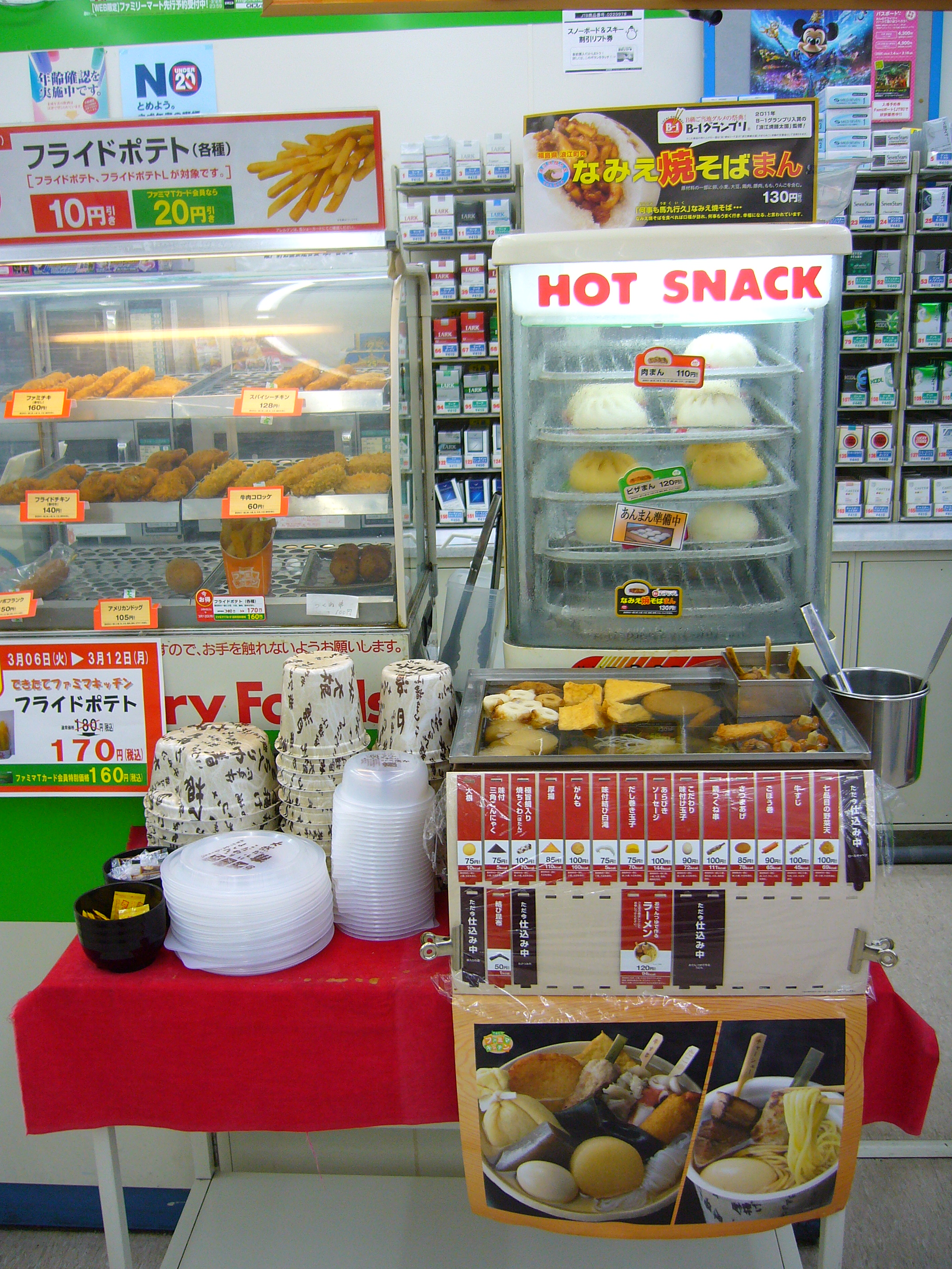 As the cold months set in, you see oden stands pop up in convenience stores all over Japan. When you want to buy some oden, you are supposed to serve yourself: just take a few pieces with the pincers provided by the store and put them in a cup. You may add some broth if you like. Then you tell or show the convenience store cashier what you took.