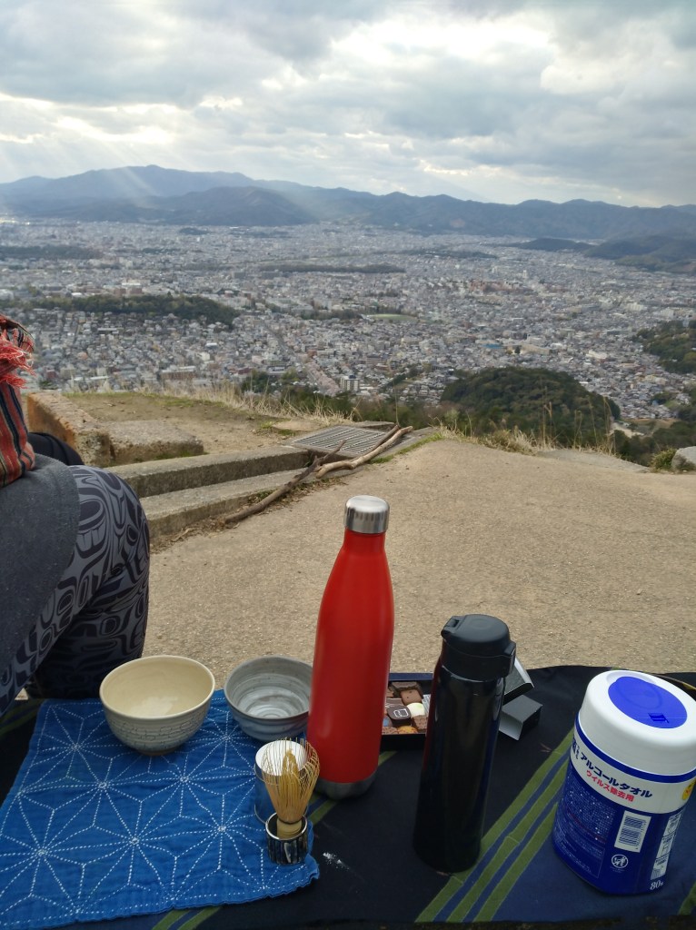 Tea at the top of Daimonji mountain. Desinfectant wipes on the right to keep things safe.